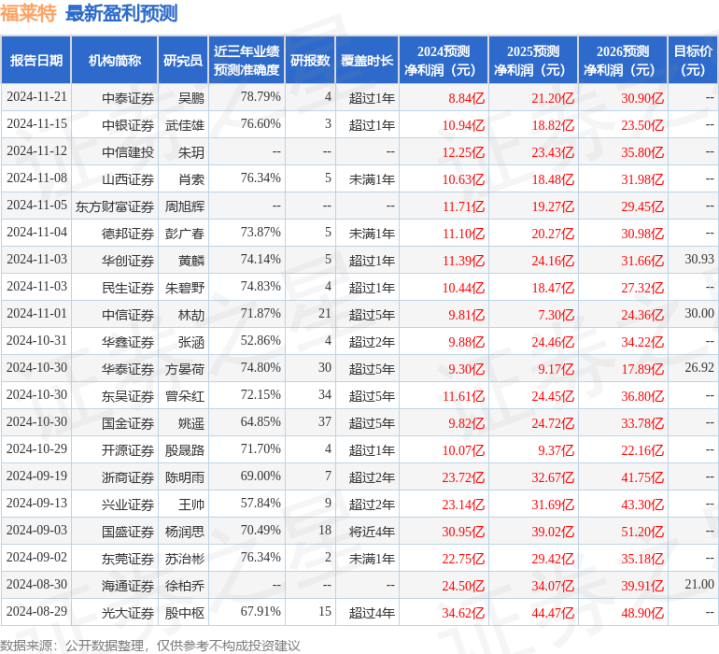 证券之星数据中心根据近三年发布的研报数据计算,中泰证券吴鹏研究员团队对该股研究较为深入,近三年预测准确度均值为78.79%,其预测2024年度归属净利润为盈利8.84亿,根据现价换算的预测PE为50.08。